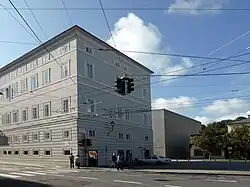 An der Ecke zur Dreifaltigkeitsgasse befinden sich vor dem Haus zwei Stolpersteine für die von den Nationalsozialisten zu Tode gebrachten Ferdinand Köck und Franz Rosenkranz. Köck wurde im Rahmen der NS-„Euthanasie“ ermordet,[24] Rosenkranz war an der Niederschlagung des Juliputschs 1934 in Lamprechtshausen beteiligt gewesen und wurde auf einem Todesmarsch vom KZ Sachsenhausen weg erschossen.[25]