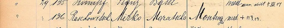 - ↑ Bei seiner Immatrikulation 1912 in Basel gab er «Moratscha, Monten[e]gro» als Heimatort an: Universitätsbibliothek Basel, Sign. AN II 5c (Rektoratsmatrikel der Universität Basel, Band 7, 1900–1930), Bl. 66v (Nr. 136).