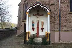 Ob die Anlage an der Kirche schon 1770 so gestaltet wurde, wie sie heute zu sehen ist und wie sie den älteren Einwohnern noch in Erinnerung ist, kann nicht mehr gesagt werden. Das Kreuz steht unter dem noch vorhandenen Schutzdach. Es hatte einen holzgeschnitzten Christuskorpus und die ebenfalls holzgeschnitzten spätgotischen Figuren von Maria und Johannes, die auf Konsolen standen, deren unterer Abschluss von Engelsköpfchen gebildet wurde. Die beiden Figuren waren[1] rheinische Schnitzarbeiten von etwa 1470/80. Wann und wie diese Kunstwerke nach Nörvenich kamen und zu dieser beeindruckenden Kreuzigungsgruppe zusammengestellt wurden, ist nicht mehr zu ermitteln.