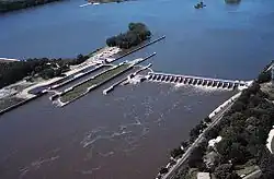 Die Saint-Anthony-Fälle in Minneapolis und ein paar kleinere Wasserfälle bei Little Falls in Minnesota waren die einzigen natürlichen Wasserfälle am Oberlauf des Mississippi. Heute prägt den Oberlauf zwischen Minneapolis und St. Louis eine Abfolge von 29 Damm- und Schleusenbauwerken, die bis in die 1940er Jahre errichtet wurden, und mit denen die Schifffahrt 123 Höhenmeter überwindet.[9] Sie wurden errichtet, um den Transport von Massengütern aus dem Norden der USA an den Golf von Mexiko zu erleichtern. Die Dämme erlauben es zudem, die Durchflussmenge des Oberlaufs zu regulieren und damit auch die des Unterlaufs zu beeinflussen. Kritiker stellen den wirtschaftlichen Nutzen der Bauwerke in Frage und beklagen deren negative ökologische Auswirkungen.[10] Die Damm- und Schleusenbauwerke werden vom United States Army Corps of Engineers instand gehalten.