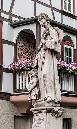 Das Bensheimer Ehepaar Ernsperger stiftete vermutlich 1747 zwei Heiligenfiguren für die Mittelbrücke: Johannes von Nepomuk und Franz Xaver. Beide stehen sich auf der Brüstungsmauer diametral gegenüber. Um 1880 wurde die beschädigte Figur des Franz Xaver durch eine neuere Darstellung ersetzt. Vermutlich wenige Jahre später ergänzte man die Darstellung des Franz Xaver durch eine Assistenzfigur, einen indischen Knaben. 1900 wurde die ebenfalls stark beschädigte Figur des Johannes von Nepomuk durch eine barocke Originalfigur ausgetauscht. Die beiden Plastiken wurden in den 1920er und 1970er Jahren restauriert und 1987 durch Kunststeinkopien ausgetauscht. Die Original-Plastiken befinden sich in der Stadtpfarrkirche St. Georg. Die Podeste und Sockel der beiden Figuren haben Inschriften über ihre Entstehungsgeschichte in Form eines Chronogramms. Es ist allerdings fraglich, ob im Laufe der Restaurierungen der Text noch originalgetreu erhalten ist. Unterhalb der Figur des Nepomuk steht: „MIChaeLstag/that Uns WohL/WeIssen/Den so grosen Unter/gang./DrUM Iohann/WIr aLLe preIsen/aCh steh beI/In Wassers zWang“. Auf dem Sockel: „EX VOTO/IOHANN GEORG/ERNSPERGER/MARIA MARGRETHA/SEIN EHEFRAU“. Der gleiche Wortlaut findet sich auf dem Sockel von Franz Xaver. Auf dem Podest der Figur steht: „franCIsCo XaVerIo/gLorIoso/noVI orbIs apostoLo/benIgno/In neCessItatIbUs patrI/ponIt/ULtIMa oCtobrIs/gratI CLIentIs pIetas“; darunter zusätzlich: „qUantIs In res a VentIs IaCtaMUr et UnDIs/anCHora tU nostrae XaVIer esto ratI“ („Dem Franziskus Xaverius dem glorreichen des neuen Erdkreises Apostel dem gütigen in Nöten Vater setzt [dieses Denkmal] am letzten Oktober eines dankbaren Schutzbefohlenen Frömmigkeit....Wenn wir in Not von starken Winden und Wellen geschüttelt werden, sollst Anker sein, Du Xavier, unserem Floße“. Nach einer Übersetzung von Kieffer, 1911)[1]
