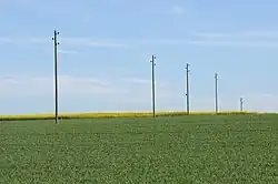 Mittelspannungsnetze sind im Regelfall in dicht verbauten Regionen als Erdkabel ausgeführt. Auf dem Erdkabel stehende Kürzel, etwa 18/30 gibt die Spannung U0 von 18 kV von Außenleiter zur Umgebung (Erde, Schirmung und Co.) an, die 30 kV Nennspannung bezieht sich auf die Spannungsdifferenz zweier unter Spannung stehende Außenleiter, vereinzelt wird die maximale Bemessungsspannung 36 kV in Klammern dahinter geschrieben: 18/30 (36) kV.[7] Auch Leitungsabschnitte, die durch Wälder führen, werden zunehmend als Erdkabel verlegt, um bei Windbruch Erdschlüsse zu vermeiden. In freien ländlichen Regionen sind Mittelspannungsleitungen, auch aus Kostengründen, als Freileitung ausgeführt.[8] Mittelspannungsfreileitungen werden auf Holz-, Beton- oder Gittermasten installiert. Ihre Leiterseile können auch auf Masten, die auch Stromkreise für höhere Spannungen tragen, untergebracht sein. Es gibt auch für 110 kV ausgelegte Freileitungen, die bis zu einer möglichen späteren Umstellung mit Mittelspannung betrieben werden. Mittelspannungsfreileitungen verwenden praktisch immer Einfachleiter und tragen meist nur einen Stromkreis, auch wenn vielerorts Leitungen mit 2 (und selten) mit noch mehr Stromkreisen existieren. Erdseile sind bei reinen Mittelspannungsfreileitungen selten, ebenso Luftkabel zur Datenübertragung. Mittelspannungsfreileitungen verfügen über viele Abzweigleitungen, die häufig über Masttrenner verfügen, um diese Leitung gezielt vom Netz nehmen zu können. Ein weiteres typisches Element von Mittelspannungsleitungen sind Masttransformatoren zur Stromversorgung kleinerer Verbraucher. Bei Freileitungen werden auch im Mittelspannungsnetz Verfahren wie die automatische Wiedereinschaltung eingesetzt, da die Fehlerursache wie ein auf die Freileitung herabgefallener Ast, Blitzeinschlag o. Ä. oft von selbst verschwindet, und damit die Versorgungssicherheit gesteigert werden kann.