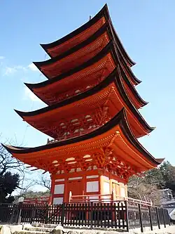 Neben der Halle steht eine fünfstöckige Pagode, die durch ihre stark orange-rote Farbe auffällt. Sie gehört auch zum Itsukushima-Schrein. Das Besondere dieser Pagode ist der zentrale Stützbalken, der von der Spitze nur ins erste Stockwerk reicht. Fünf Pagoden dieser Art soll es in Japan geben.