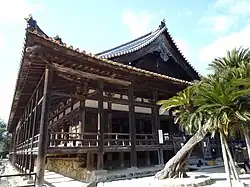 1587 befahl Toyotomi Hideyoshi, diese Halle zu bauen, um hier jeden Monat buddhistische Sutren zur Tröstung der Seelen der Kriegsgefallenen singen zu lassen. Als Hideyoshi 1598 starb, war das Gebäude noch nicht fertiggestellt, es fehlen Wände und Decken. Der eigentliche Name dieser Halle ist Toyokuni-Schrein (豊国神社, Toyokuni-jinja, dt. etwa „Schrein des üppigen Landes“), so benannt 1872 und der Seele Hideyoshis gewidmet; aber im Allgemeinen nennt man ihn Senjō-kaku (千畳閣), „Turm der tausend Tatamis“, eine Anspielung auf die Größe der Halle, die aus massiven Holzbalken- und Pfeilern erbaut ist.