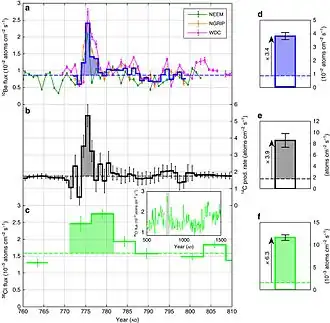 - ↑ Cosmic ray event of A.D. 774–775 shown in quasi-annual 10Be data from the Antarctic Dome Fuji ice core. In: Geophysikal Research Letter. Abgerufen am 5. Mai 2024.