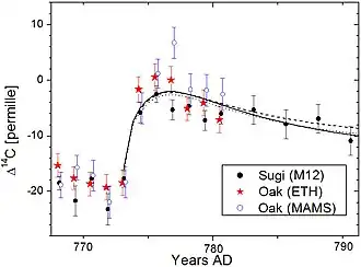 - ↑ a b Ilya Usoskin et al.: The AD775 cosmic event revisited: the Sun is to blame. In: Astronomy & Astrophysics. Band 552, L3, 18. März 2013, S. 1–4, doi:10.1051/0004-6361/201321080.