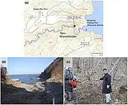 „1933“: weiße Markierung der Tsunamihöhe von 1933 an Klippe (10 m, gemessen an einer etwas anderen Stelle; an dieser Stelle waren 7,0 und 6,4 m gemessen worden).[14]