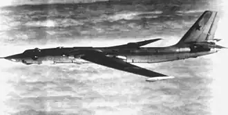 Die in der UdSSR gebaute Mjassischtschew M-4, auch als „Molot“ (Hammer) bezeichnet, hatte am 20. Januar 1953 mit Fjodor Opadtschi[4] ihren Erstflug und wurde am 20. Juli 1954[5] erstmals auf der traditionellen Luftparade in Moskau-Tuschino öffentlich vorgestellt. Die Maschine war der erste vierstrahlige strategische Langstreckenbomber der Sowjetunion und sollte eine Alternative zur gleichzeitig entwickelten Tupolew Tu-16 darstellen. Die Reichweite des Bombers war anfangs jedoch noch zu begrenzt, um US-Ziele zu erreichen, da Mjassischtschew kein praktikables Verfahren entwickeln konnte, um das Flugzeug in der Luft zu betanken. Dies war westlichen Militärbeobachtern jedoch zunächst nicht bekannt. Unterhalb der Triebwerke konnte unter jeder Tragfläche je ein Zusatztank mitgeführt werden, was aber nur sehr selten praktiziert wurde. Das Mitführen von Ch-26-Seezielflugkörpern anstelle der Zusatztanks wurde an einem Prototyp erfolgreich getestet, jedoch aus Kostengründen nicht implementiert, da mit Tu-16 und Tu-95 kein Bedarf mehr an einem weiteren Lenkwaffenträgerflugzeug bestand.[6] Die M-4 wurde zur M-4A mit stärkeren AM-3M-Triebwerken und verbesserter Radarausrüstung weiterentwickelt. Mit einer Betankungssonde direkt vor dem Cockpit ausgerüstet, war sie nun auch in der Lage, durch Kraftstoffübernahme in der Luft höhere Reichweiten zu erzielen.