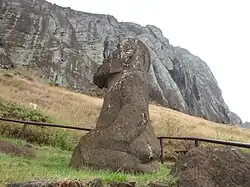 Rund um den erloschenen Vulkankrater Rano Raraku befinden sich 396 Moai, die heute meist bis zur Brust bzw. Halspartie in den Boden eingegraben sind.[22] Die Vielzahl dieser Statuen lässt sich alleine mit der „Zwischenlagerung“ für die spätere Fertigstellung nicht erklären. Der deutsche Ethnologe Hans Schmidt unterschied daher bereits 1927 den „Ahu-Typus“ und den „Raraku-Typus“ und vermutete, dass überhaupt nicht beabsichtigt gewesen sei, die letzteren an einen anderen Standort zu transportieren.[23] Dafür spricht auch, dass 21 Statuen im Innern der Caldera aufgestellt sind, ein Platz, der für den Weitertransport zu den an der Küste gelegenen Ahu denkbar ungeeignet gewesen wäre. Katherine Routledge hat 1914 eine dieser Statuen ausgegraben und festgestellt, dass deren Basis keilförmig zugehauen war, im Gegensatz zur flachen und breiteren Basis der Statuen auf den Ahu.[24] Die Ausgrabung von zwei Moai am Südhang der Caldera im Jahr 2014 legte bis auf das Grundgestein reichende Gruben an der Basis frei, in denen die Statuen auf einer sorgfältig angelegten Pflasterung positioniert und mit angehäuftem Kies und Felsbrocken aufrecht gehalten wurden.[25]
