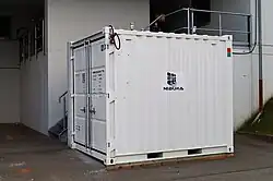 Mobile Hochtemperaturspeicher[7] werden i. d. R. in klassischen ISO Containern (10 Fuß, 20 Fuß und 40 Fuß) integriert und können Wärme im zweistelligen MWh Bereich aufnehmen und ausliefern. Das Anwendungsspektrum der eingespeicherten Wärme bei Hochtemperaturspeichern ist aufgrund der hohen Temperaturen größer: Rückverstromung, Prozesswärme, Kälte sowie Heiz- und Brauchwasser.