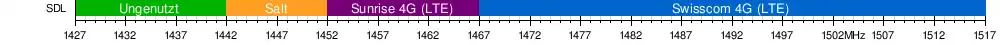 Anfang 2019 wurden im 1400-MHz-Bereich 18 Frequenzblöcke à 5 MHz als Supplemental Downlink (SDL) versteigert. Damit ein Mobiltelefon dieses Frequenzband nutzen kann, muss bereits eine Uplink-/Downlink-Verbindung in einem anderen Band bestehen. Das ungepaarte Spektrum verteilt sich auf die Netzbetreiber Salt (10 MHz), Sunrise (15 MHz) und Swisscom (50 MHz), die verbleibenden 15 MHz wurden nicht zugeteilt und bleiben vorerst ungenutzt.[5] Die ersteigerten Frequenzen befinden sich im Bereich des Band 75 und Band 76.[20] Die Nutzung dieser Frequenzen unterliegt lokalen Einschränkungen, zum Beispiel in der Nähe von Flughäfen oder des benachbarten Auslands. In einer Quelle wird Band 76 auch Band 32 genannt.[8]