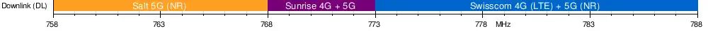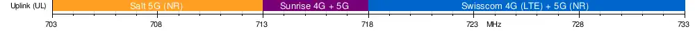 Auf diesem Frequenzband realisieren Swisscom (15 MHz; NR-ARFCN 155770) und Salt (10 MHz; NR-ARFCN 152450) die landesweite Grundversorgung mit NR/5G.