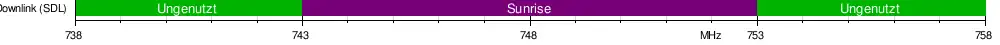 Zusammen mit dem gepaarten Spektrum im 700 MHz-Band wurde Anfang 2019 auch der Frequenzbereich von 738 – 758 MHz (E-UTRA Band 67) als sogenannter Supplemental Downlink (SDL) versteigert.[5] Damit soll zusätzliche Bandbreite im Downlink zur Verfügung stehen. Im SDL ersteigerte der Netzbetreiber Sunrise 10 MHz 743 -753 MHz, die verbleibenden beiden 5 MHz wurden nicht zugeteilt und bleiben vorerst ungenutzt.[8]