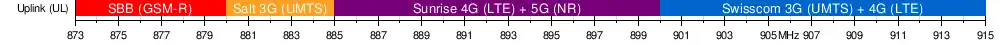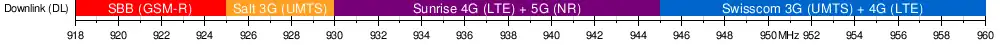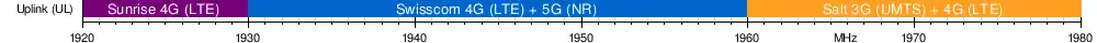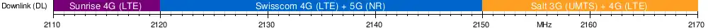 Dieser früher für UMTS verwendete Bereich wird heute bei allen drei Schweizer Anbietern für LTE verwendet[23][24]. Swisscom stellte hier 3G am 1. Oktober 2019 auf 5G um (20 MHz; NR-ARFCN 425310)[25][26][27] .