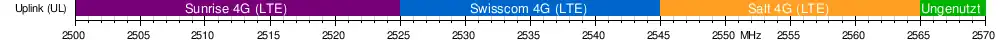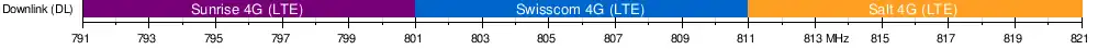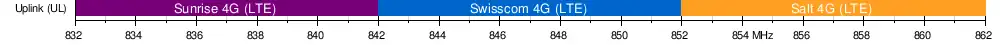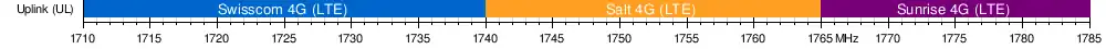 Alle drei Netzbetreiber sicherten sich ein Spektrum von jeweils 20 MHz[10], d. h. 10 MHz im Downlink, 10 MHz im Uplink und verwenden es schweizweit ausschliesslich für die 4. Mobilfunkgeneration LTE.[1]