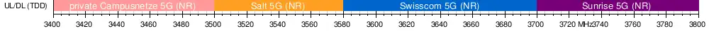 Anfang 2019 wurden im 3,5-GHz-Bereich 15 Frequenzblöcke à 20 MHz als ungepaartes Spektrum zur Nutzung im Zeitduplex (TDD) versteigert. Das Spektrum verteilt sich auf die Netzbetreiber Salt (80 MHz; NR-ARFCN 636000), Sunrise (100 MHz; NR-ARFCN 650016) und Swisscom (120 MHz; NR-ARFCN 640704), die unteren 200 MHz im Band 78 standen nicht zur Versteigerung.[5] Die Aufteilung der Frequenzblöcke auf das Spektrum war zum Zeitpunkt der Mitteilung noch unbekannt. Die Nutzung dieser Frequenzen unterliegt lokalen Einschränkungen, zum Beispiel in sogenannten Freihaltezonen und in der Nähe von Satelliten-Bodenstationen. Sunrise setzt das Band 78 für 5G ein.[30] Diese Frequenz wird auch als C-Band bezeichnet.[28]