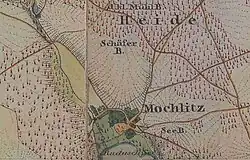 Im Jahr 1708 lebten in Mochlitz nur zwei Kossätenfamilien. Das Dorf hatte eine Schatzung von 500 Gulden. 1723 waren zu den zwei Kossäten drei Büdner hinzugekommen. Im Schmettauschen Kartenwerk von 1767/87 ist nordwestlich von Mochlitz am Lieberoser Mühlenfließ die Mochlitzer Mühle eingezeichnet und nur wenig davon entfernt auch eine Windmühle. Die (um 1900 so bezeichnete) Mochlitzer Mahlmühle ist als Kolonie bezeichnet. Die (alte) Wassermühle ist noch um 1900 existent, die Windmühle ist dagegen verschwunden. 1790 mussten die Mochlitzer ihre Kinder nach Ullersdorf in die Schule schicken; Ullersdorf hatte bereits einen festangestellten Schulmeister.[19] 1793 werden fünf Freihäusler erwähnt. 1809 wohnten zwei Kossäten und sechs Häusler oder Büdner in Mochlitz. 1818 wurden 16 „Feuerstellen“ und 81 Einwohner gezählt.[11] Separat aufgezählt ist die Mochlitzer Wassermühle mit einer Feuerstelle und fünf Bewohnern. 1840 werden nun 16 Wohngebäude genannt, in denen 76 Menschen lebten.[12] Der Ort wird als „Dorf mit einer Wassermühle“ bezeichnet. Berghaus (1855) nennt eine Wassermühle und eine Holländische Windmühle für Mochlitz erwähnt. Der Gutsbezirk hatte eine Größe von 3818 Morgen, die bäuerliche Feldmark betrug dagegen nur 271 Morgen.[20] Allerdings ist zu vermuten, dass die Holländische Windmühle irrtümlich hier aufgeführt ist. Sie ist auch nicht im Urmesstischblatt von 1846 verzeichnet und wird in keiner anderen Quelle erwähnt. 1864 standen 21 Häuser in Mochlitz, in denen 104 Menschen wohnten.[15] Die Wassermühle war im Besitz eines gewissen Schütze.[16] Bis um 1900 war die Oberförsterei Mochlitz eingerichtet worden. In der Topographischen Karte 1:25.000 Blatt 3952 Groß Muckrow ist am Ostufer des Raduschsees ein Park eingezeichnet. 1929 wurden der Gutsbezirk Mochlitz aufgelöst und in die Gemeinde eingegliedert.[21] Nach dem Zweiten Weltkrieg wurde in Mochlitz die Landwirtschaftliche Produktionsgenossenschaft (LPG) Heideland gegründet.[22] Der Sitz der Revierförsterei Mochlitz befindet sich heute im Schlosshof in Lieberose. Die Jagdgenossenschaft Jamlitz-Mochlitz hat den kleinen Ort in ihrem Namen behalten.[23]