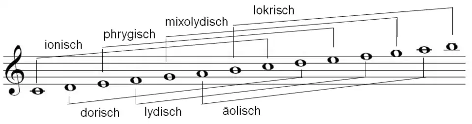 | Dorisch Hypodorisch Phrygisch Hypophrygisch Lydisch Hypolydisch Mixolydisch Hypomixolydisch Äolisch Hypoäolisch Ionisch Hypoionisch Lokrisch |