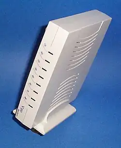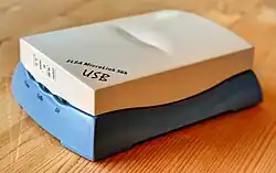 Der oder das Modem (Kofferwort aus Modulator und Demodulator)[1] ist ein Kommunikationsgerät, um digitale Signale über weite Übertragungswege zwischen zwei digitalen Endgeräten auszutauschen. Vom sendenden Modem wird ein digitales Signal auf eine Trägerfrequenz im Hochfrequenzbereich aufmoduliert, vom empfangenden Modem wird daraus die ursprüngliche Information durch Demodulieren zurückgewonnen. Dabei arbeiten Modems des neueren Standards DSL mit höheren Trägerfrequenzen und größeren Bandbreiten auf der Telefonleitung als die Modelle nach dem älteren „Schmalband“-Standard. Der Begriff Modem war in den 1970er bis 1990er Jahren präsenter als später, weil die Benutzung eines Modems damals synonym mit online gehen war, also damit, seinen Computer mit anderen zu vernetzen.