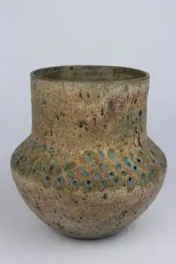 Die als Einzelstücke in einem Atelier entstandene Keramik, im englischsprachigen Bereich hierfür auch zusammenfassend studio pottery (Studio-Töpferei),[1] kommt erst gegen Ende des 19. Jahrhunderts durch den Einfluss vor allem ostasiatischer (chinesischer und japanischer) Keramik und in der Aufbruchsstimmung des Jugendstils zur Geltung. Vor allem die japanische Gefäßkeramik in ihrer freieren und abstrahierenden Formgebung, ihrem unkonventionellen Umgang mit dem Material Ton und den experimentellen Möglichkeiten der Glasurgestaltung (vgl. Abb. 1) inspirierten die Pioniere der modernen Kunstkeramik. Die Keramikerdynastie Massier im französischen Vallauris, wo heute noch eine Biennale für zeitgenössische Keramikkunst stattfindet, hatte daran erheblichen Anteil. Auch Pablo Picasso verbrachte einige Jahre seines Künstlerlebens (1948–1955) in Vallauris und schuf dort bedeutende Keramikskulpturen. In England war Bernard Leach – auch unter dem Einfluss japanischer Volkskunstkeramik – stilbildender Vorreiter (s. Abb. 2).