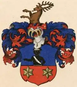 Das Wappen (1650) zeigt im geteilten Schild, oben in Blau einen wachsenden Mohr mit silbernem Kopfwulst, schräger Schärpe und Leibschurz, die Rechte ausstreckend, unten in Rot nebeneinander zwei goldene Sterne. Auf dem blau-rot bewulsteten Helm mit blau-roten Decken ein wachsender natürlicher Hirsch.