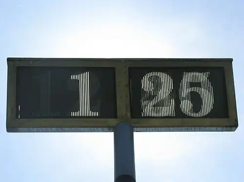 Ein weiteres Beispiel für eine übergeordnete Struktur in einem der beiden Linienmuster ist eine digitale Sonnenuhr (Abbildung 7). Das Sonnenlicht ändert über den Tag seine Richtung. Das zwei Linienmuster durchscheinende Licht generiert eine digitale Zeit-Anzeige, die sich alle fünf Minuten ändert.[5]