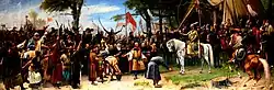 Auf dem Gemälde „Honfoglalás“ (Landnahme) von Mihály Munkács empfängt Mojmir II. den ungarischen Großfürsten Árpád mit seinem Gefolge