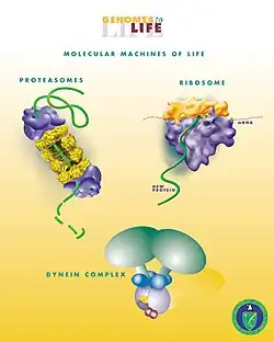 Die komplexesten molekularen Maschinen sind die in den Zellen vorkommenden Proteine. Diese umfassen die Motorproteine wie Myosin, das verantwortlich ist für die Muskelkontraktion, Kinesin, das die Organellen in den Zellen mit Mikrotubuli vom Zellkern wegtransportiert, Dynein, das die Bewegung der Geißeln hervorruft und membranständige ATPasen wie die ATP-Synthase. Diese Proteine und ihre auf der Nanometerskala befindliche Dynamik sind komplexer als alle molekularen Maschinen, die je konstruiert wurden. Die wahrscheinlich bedeutendsten biologischen Maschinen sind die Ribosomen. In der Tat sind Mikrotubuli Nanomaschinen, die aus über 600 Proteinen in Molekülkomplexen bestehen.[5] Die ersten sinnvollen Anwendungen dieser biologischen Maschinen mag es in der Nanomedizin geben. Zum Beispiel[6] könnten sie verwendet werden, um Krebszellen zu erkennen und zu zerstören.[7][8] Molekulare Nanotechnologie ist ein Unterkapitel der Nanotechnologie, betrachtet man die gesamten Möglichkeiten der molekularen Mechanik, könnten biologische Maschinen eine Therapie auf molekularer oder atomarer Ebene betreffen. Nanomedizin könnte diese Nanoroboter verwenden, um Schäden oder Infektionen festzustellen und zu reparieren. Molekulare Nanotechnologie ist hoch theoretisch, um vorwegzunehmen, dass Erfindungen auf dem Gebiet der Nanotechnologie erfolgversprechend sind und ein zukunftsweisendes Forschungsgebiet. Der gegenwärtige Stand der Forschung der Nanotechnologie mit den vorgeschlagenen Elementen ist noch weit entfernt von Nanorobotern.[9][10]