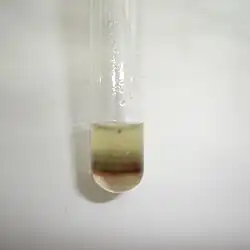 Hinweis: Der Nachweis ist so sensitiv, dass am besten mit neuen Reagenzgläsern gearbeitet wird. Bereits kleinste Zuckerrückstände, welche sich noch im Reagenzglas befinden könnten, würden den Nachweis stören. Die Untersuchungen zeigen, dass nur ein einziger Tropfen einer 0,005%igen Rhamnose-Lösung ausreicht, um eine gut sichtbare Farbreaktion hervorzurufen.