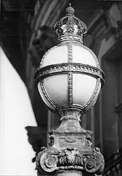 Als Schmuck dienen die durchbrochenen Baluster der Balustrade und die säulenförmigen Leuchtenträger aus Granit mit in Bronzeguss gefassten Kugelleuchten. Die gewählte Materialkombination ist auf den neobarocken Baustil des Museums abgestimmt. Der südliche Brückenteil der Monbijoubrücke überspannt unter einem Winkel von 90° den als Kupfergraben oder Spreekanal bezeichneten linken Seitenarm der Spree und stößt an die Straße Am Kupfergraben. Es ist eine einbogige Gewölbebrücke mit 18 m Öffnungsweite, bei einer Gesamtlänge von 25 m und einer Breite von 14 m zwischen den Brüstungen. Die Bauhöhe im Bogenscheitel beträgt 0,73 m. Der nördliche Teil überbrückt den Hauptarm der Spree und öffnet sich zur Monbijoustraße. Diese unter einem Winkel von 82,5° zur Spree ausgerichtete Brücke bestand aufgrund des schlechten Baugrundes aus zwei Steingewölben mit je 17,25 m lichter Weite. Zwischen den beiden Bögen war ein 2,4 m breiter Pfeiler angeordnet. Der Baugrund bedingte für das nördliche Bogenwiderlager eine aufwendige Gründung in 18 m Tiefe auf einem hölzernen Senkkasten.[3] Direkt hinter der Monbijoubrücke vereinen sich die beiden Spreearme.