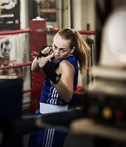 Monika Schwarz (* 27. April 1989 in Memmingen) ist Deutsche Meisterin, zweifache Deutsche Vizemeisterin, zweifache Deutsche Hochschulmeisterin und mehrfache Hessenmeisterin im olympischen Boxen.[1][2][3] Hauptberuflich ist Monika Schwarz Sprachtherapeutin mit eigener logopädischen Praxis in Wiesbaden[4]. Sie begann mit dem Boxsport erst im Erwachsenenalter und erkämpfte sich schnell mehrere Landes- und Bundestitel. Monika Schwarz boxt in der Rechtsauslage[5] und wechselt variabel zwischen Konter- und Angriffsboxen. Sie gilt als äußerst willens- und kampfstark. Seit mehreren Jahren boxt sie für den Boxverein in Mainz-Kostheim.[6][7]