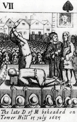 Monmouth floh vom Schlachtfeld, wurde jedoch am 8. Juli in einem Graben gefangen (entweder in Ringwood im New Forest, oder in Horton in Dorset). Das Parlament hatte eine Bill of Attainder erlassen und am 13. Juni war Monmouth zum Tod als Verräter verurteilt worden, weshalb ein Prozess vor seiner Hinrichtung nicht nötig war. Obwohl er um Gnade bat und er angeblich zum Katholizismus konvertiert sei, wurde er am 15. Juli 1685 am Tower Hill von Jack Ketch enthauptet. Es heißt, dass mehrere Axtschläge nötig gewesen sein sollen, um seinen Kopf abzutrennen. Wenngleich manche Quellen sagen, es seien acht Schläge gewesen, schreibt die offizielle Internetseite des Tower of London, es wären fünf gewesen, Charles Spencer behauptet in seinem Buch Blenheim hingegen, es wären sieben gewesen.[32] Der Henker in „Punch and Judy“ ist nach dem Henker Monmouths, Jack Ketch, benannt. Die Herzogswürden von Monmouth und Buccleuch verfielen mit dem Tod Monmouths.