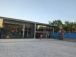 Das Gebäude hinter dem Eingangspavillon wurde im Jahr 2000 im Rahmen eines Aufwertungsprogramms künstlerisch gestaltet. In dessen Fassade fügte die Künstlergruppe Les industries perdus mit Ziegelsteinen das Gedicht Tango de Montréal von Gérald Godin ein. Es handelt von den Einwanderern, die morgens mit der Metro zur Arbeit fahren und die Stadt am Laufen halten.[3]