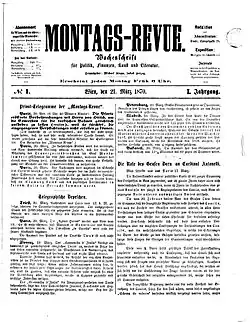 Die Montags-Revue war eine von 1870 bis 1915 erscheinende Wiener Wochenzeitung. Sie wurde am 21. März 1870 als „Wochenschrift für Politik, Finanzen, Kunst und Literatur“ von Michael Kapp und Jakob Herzog begründet[1] und erschien jeweils am Sonntagnachmittag um 2 Uhr.[2] Nebst Telegrammen und allgemeinen Nachrichten enthielt sie politisch einflussreiche Originalartikel und Korrespondenzen aus dem In- und Ausland.[2] Bedeutsam waren ferner ihr Feuilleton und die literarische Beilage mit Beiträgen namhafter Schriftsteller und Schriftstellerinnen wie Theodor von Frimmel, Ferdinand Kürnberger, Alexander Sacher-Masoch, Anton Schlossar, Eduard Suess, Georg Brandes und Emilie Hüni.[1][2] Politisch betonte sie ihre Unabhängigkeit, war zu Beginn aber „offiziös“.[1] Herzog gab die Zeitung bis zu seinem Tod am 10. April 1915 heraus.[3] Danach wurde sie eingestellt. Die letzte Ausgabe erschien am 3. Mai 1915.[1]