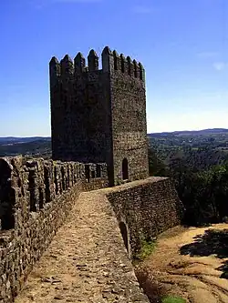 - Burganlage Montemor-o-Novo mit dem Wächterhaus und dem Glockenturm im Eingangsbereich. Die nördlich gelegenen Burgmauern sind vollständig erhalten.