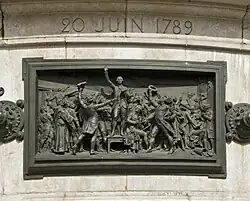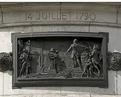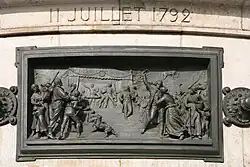 Der Steinsockel ist von zwölf bronzenen Hochreliefs umgeben, die durch Rosetten verbunden und auf Augenhöhe der Passanten angeordnet sind. Sie stellen eine Chronologie der Ereignisse dar, die die Geschichte der Französischen Republik zwischen 1789 und 1880 prägten: