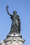 Die Spitze des Sockels wird von einer 9,5 m hohen Bronzestatue eingenommen: das Symbol der Republik, die Marianne. Sie wird stehend dargestellt, trägt eine Toga und ist mit einem Wehrgehänge umgürtet, an dem ein Schwert befestigt ist. Sie trägt sowohl die phrygische Mütze, Symbol der Freiheit, als auch eine Pflanzenkrone.