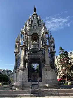 Karl floh erst nach London, dann nach einem missglückten Versuch seinen Thron zurückzugewinnen, nach Paris. Die Verwandten Karls versuchten auf verschiedene Weise vergeblich ihm die Verfügungsgewalt über sein Vermögen zu entziehen, da er dieses unter anderem auch dafür einsetzte, seine Rückkehr auf den Braunschweiger Thron zu betreiben. Bei den Zeitgenossen war Karl vor allem wegen seiner Skandalgeschichten und wegen seines extravaganten Lebensstils bekannt. 1870 zog Karl wegen des Deutsch-Französischen Krieges nach Genf, wo er am 18. August 1873 ohne direkte Nachkommen verstarb. In seinem Testament setzte er die Stadt Genf als Alleinerbin ein, wobei er sich die Errichtung eines Grabmals nach eigenen Plänen an einem prominenten Ort in Genf ausbedang. Sein Bruder Wilhelm einigte sich mit Genf am 6. März 1874 gütlich über die Aufteilung des Erbes,[1] worauf der Stadt noch eine Summe von 24 Millionen Franken verblieb, was heute ca. 1 Mia. Schweizer Franken entsprechen soll.[2] Nach einigen Diskussionen wurde das Grabmal 1879 von der Stadt Genf im Jardin des Alpes errichtet und am 14. Oktober 1879 eingeweiht.