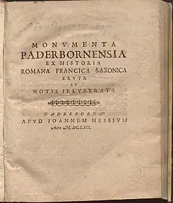 Die Monumenta Paderbornensia wurden von Bischof Ferdinand von Fürstenberg verfasst und erschienen erstmals 1669. Eine deutsche Übersetzung von Franz Joseph Micus (1801–1860) erschien 1844 unter dem Titel Denkmale des Landes Paderborn in Paderborn. Für die Illustrationen hat Johann Georg Rudolphi die Vorlagen für zahlreiche Stiche angefertigt.