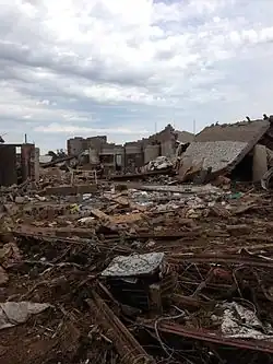 Der Moore-Tornado 2013 war eine Naturkatastrophe am Montag, 20. Mai 2013, in Oklahoma, USA. Durch den Tornado wurden in Moore, Newcastle, Southern Oklahoma City und angrenzenden Gebieten mindestens 24 Personen getötet und 377 verletzt.[2][1] Der Tornado war Teil eines größeren Wettersystems, das in den beiden Tagen zuvor und auch am Folgetag zahlreiche weitere Tornados hervorbrachte. Der knapp 2 Kilometer breite Tornado erreichte um 14:56 Uhr Ortszeit (19:56 Uhr UTC) den Boden und hielt für etwa 40 Minuten und etwa 27 km Bodenkontakt.[3][4] Der Aufsetzpunkt des Tornados lag westlich von Newcastle, Oklahoma. Der Wirbelsturm zog durch ein dicht bewohntes Gebiet von Moore und bildete während seines Höhepunktes einen Pfad der Zerstörung mit einer Breite von etwa drei Kilometern.[5]