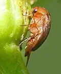 Das Tier ist oberseits und unterseits einfarbig gelbrot. Der Körper ist der Länge nach stark gewölbt, der Breite nach oberseits schwach gewölbt. Die Unterseite ist kielartig zusammengedrückt. Das Hinterende ist zu einer hornigen Spitze ausgezogen. Ohne diese Spitze gemessen erreicht der Käfer eine Länge von knapp drei bis zu vier Millimeter.