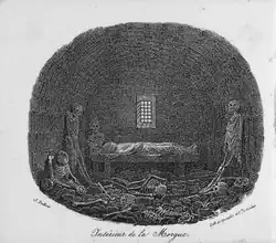 Im Rahmen der Burgunderkriege kam es am 17. und am 19. April 1476 auf dem Grossen St. Bernhard zu Kampfhandlungen zwischen den mit Bern verbündeten Wallisern und mit Burgund verbündeten Piemontesen unter der Anführung des Herzogs Louis de Challant. Die nach den Urkunden 1476 errichtete Neue Morgue des Hospizes diente der Überlieferung nach als Ossuarium für die Gefallenen.[1] In den folgenden Jahrhunderten wurden in dem kleinen Gebäude Bergopfer bestattet. Das Gelände des Hospizes ist weitgehend felsig. Zudem ist der Boden für sieben Monate im Jahr gefroren. Eine Bestattung der am Pass im Winter umgekommenen Reisenden und Bergopfer war somit vor Ort mit vertretbarem Aufwand nicht möglich. Die Toten wurden daher aus Platzgründen – so, wie sie aufgefunden wurden – zunächst in Laken gehüllt auf einem Tisch aufgebahrt, dann mit Schnüren an Brettern fixiert und senkrecht in der hinteren Kammer des Gebäudes aufgestellt. Durch die trockene Luft, die durch zwei gegenüberliegende vergitterte Wandöffnungen zog, und durch die Kälte mumifizierten die Körper, und sie bewahrten über viele Jahre weitgehend ihr Aussehen und ihre Gesichtszüge. Pater Detry berichtete 1949, ein Besucher habe noch nach vielen Jahren seinen Onkel erkannt. Mit der Zeit lösten sich die Schnüre, und die zusammengefallenen Körper verrotteten aufgrund der Bodenfeuchte. Die Gebeine wurden dann in der vorderen Kammer gestapelt.[2]