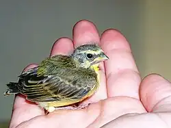 Jungvögel sind auf der Körperoberseite etwas bräunlicher als die adulten Vögel und weisen mehr Längsstreifen auf. Die Körperunterseite ist blasser gelb, die Region von Kinn bis zur Brust ist bräunlich überwaschen, die Brustseiten und die Flanken gehen in ein Olivbraun über. Auf der oberen Brust weisen sie einige dunkle braune Flecken auf, auf den Flanken befinden sich dünne Längsstreifen.[2]