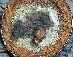 Das Nest wird vom Weibchen gebaut. Es wird vom Männchen begleitet, wenn es Nistmaterial sammelt und das Männchen sitzt in der Nähe und singt, wenn sie das Nistmaterial verbaut. Das Gelege besteht normalerweise aus zwei bis drei Eiern. Die Eier sind weißlich, nur einige weisen gelegentlich feine orange-braune Kritzel oder dunkelbraune Flecken auf. Es brütet allein das Weibchen, das Männchen hält sich in der Nähe auf und singt häufig von einer Warte nahe dem Nest. Er trägt außerdem Futter heran, mit dem er das Weibchen füttert. Die Brutzeit beträgt 13 bis 14,5 Tage.[6] Die Nestlingszeit beträgt 16 bis 24 Tage. Die flügge gewordenen Jungvögel werden zunächst noch von beiden Elternvögeln gefüttert und bilden mit diesen einen dicht zusammenbleibenden Familienverband.[7]