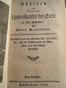 1763 gewann Mendelssohn noch vor Immanuel Kant den Ersten Preis der „Königlichen Academie“ mit einem philosophischen Aufsatz und wurde damit als Denker allgemein anerkannt. 1767 veröffentlichte er Phädon oder über die Unsterblichkeit der Seele – einen viel gelesenen philosophischen Text, der in mehreren Auflagen erschien und in zehn Sprachen übersetzt wurde. Dieses Werk ist eine Interpretation des platonischen DialogsPhaidon, „modernisiert und in Wolffische Metaphysik verwandelt“ (Hegel). Seinen Dialogen stellte Mendelssohn – von Zeitgenossen als „deutscher Sokrates“ bezeichnet – eine lesenswerte Biographie zu „Leben und Charakter des Sokrates“ voran.
