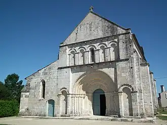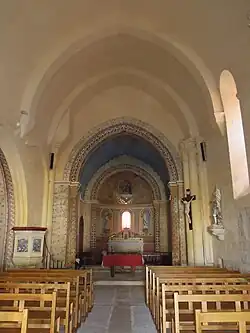 Die romanische Pfarrkirche Saint-Saturnin steht seit 1990 als Monument historique unter Denkmalschutz,[3] die Westfassade und die Apsis bereits seit 1913.[4] Der Bau stammt im Wesentlichen aus dem 12. Jahrhundert. An die ursprünglich einschiffige Kirche mit halbrunder Apsis wurde im 15. Jahrhundert wurde an der Nordseite ein dreijochiges Seitenschiff angebaut. Ein Stufenportal mit fünf gestaffelten Bögen und mit einfachen Motiven verzierten Archivolten nimmt nahezu die gesamte Breite der ursprünglichen Westfassade ein; nur rechts und links schließt sich jeweils ein relatives kleines Blindportal an. Darüber reicht eine Blendarkatur mit fünf Rundbögen auf von schlanken Halbsäulen flankierten Pilastern nahezu über die gesamte Breite der Fassade; nur der mittlere Bogen enthält ein Fenster. Die Archivolten und Kapitelle sind schmuckvoll verziert. Die Fassade des im 15. Jahrhundert angebauten Seitenschiffs ist schmucklos und durch eine kleine Tür und ein Rundbogenfenster durchbrochen. Die Außenseite der an die den mächtigen Turm tragende Vierung anschließenden Apsis ist überaus reich verziert. Der gedrungene Turm hat quadratischen Grundriss und ein ziegelgedecktes Pyramidendach. Um einen Einsturz zu verhindern, wurde, wahrscheinlich im 15. Jahrhundert, an seiner Nord- und Südseite die Außenmauer durch Vorsetzen einer zweiten Mauer verstärkt, die im unteren Teil auf einer Blendarkade mit zwei Bögen auf einer zentralen Halbsäule ruht. Die ursprüngliche Mauer ist in diesem Bereich weiterhin sichtbar. Unter dem Dach hat der Turm je drei viereckige Öffnungen, die einst zur Beobachtung und Verteidigung dienten, heute die Funktion von Schallluken erfüllen. Im Kircheninneren sind die Vierung und der Altarraum in der Apsis reich ausgemalt. An der südlichen Längswand des Langhauses befinden sich Wandmalereien aus der Zeit der Romanik. Die Stirnwand des Seitenschiffs ist mit der Maria (Mutter Jesu) gewidmeten Gemälden ausgeschmückt.