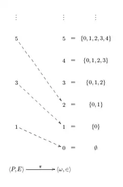 stellt also einen Isomorphismus zwischen den Strukturen und dar, und ist die einzige transitive Menge, die (mit der Relation ) zu isomorph ist.