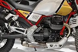 Der Motor ist wie bei Moto Guzzi üblich, ein längs eingebauter luftgekühlter 90-Grad-V2-Viertaktmotor. Er hat zwei Ventile pro Zylinder, die von einer zentralen Nockenwelle über Stößel, Stoßstangen und Kipphebel betätigt werden. Das Einlassventil besteht aus Titan, dessen vergleichsweise geringes Gewicht ein scharfes Nockenprofil ermöglicht. Das Gemisch bereitet eine elektronische Einspritzung auf und die Luftzufuhr regelt eine zentrale Drosselklappe, deren Durchmesser 52 mm beträgt. Sie ist elektronisch gesteuert (sog. Ride-by-Wire), wodurch unterschiedliche Ansprechverhalten realisiert werden können.