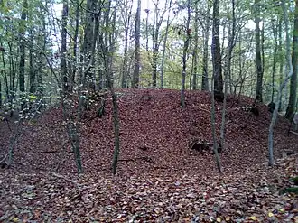Die Gemarkung wird im Kataster als auch im Dialekt als Burgknopp bezeichnet. Fälschlicherweise geht der Volksmund bis heute davon aus, dass es sich um einen Grabhügel – genauer um ein Römergrab – und nicht um eine Befestigungsanlage handelt. Der ursprüngliche Turmhügel hatte eine Höhe von etwa acht Metern bei einem Durchmesser von 15 Metern bis 20 Metern. Die künstlich aufgeschüttete Erhebung, die ursprünglich von einem Graben umgeben war, ist das einzige sichtbare übriggebliebene Merkmal der Anlage. Grabungen fanden 1860, 1912 und 1926 statt. Dabei wurden Keramiken (u. a. Reste eines Kugelbauchtopfs) und Werkzeuge gefunden. Von der hölzernen Palisade, dem Turm und den Wirtschaftsgebäuden fanden sich keine Überreste mehr. Die Motte hatte vermutlich die Aufgabe, den Schutz der in unmittelbarer Nähe auf der heutigen Gemarkung Schönfeld liegenden Eisenerzgruben sicherzustellen. Im Mittelalter fanden sich hier auch Schmelzen. Der Erzabbau wurde erst Mitte des 19. Jahrhunderts dort endgültig eingestellt.