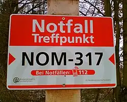An markanten Punkten wie Lichtungen, Ortsrändern oder Waldparkplätzen befinden sich seit 2012 Notfallschilder. Es handelt sich um rot-weiße Schilder mit Identifikator. Hilfesuchende, die an diesen Stellen mittels Mobiltelefon einen Notruf absetzen, können vom Rettungsdienst besonders schnell versorgt werden.[2] Die Niedersächsischen Landesforsten stellten dazu eine Mobile App bereit.[3]